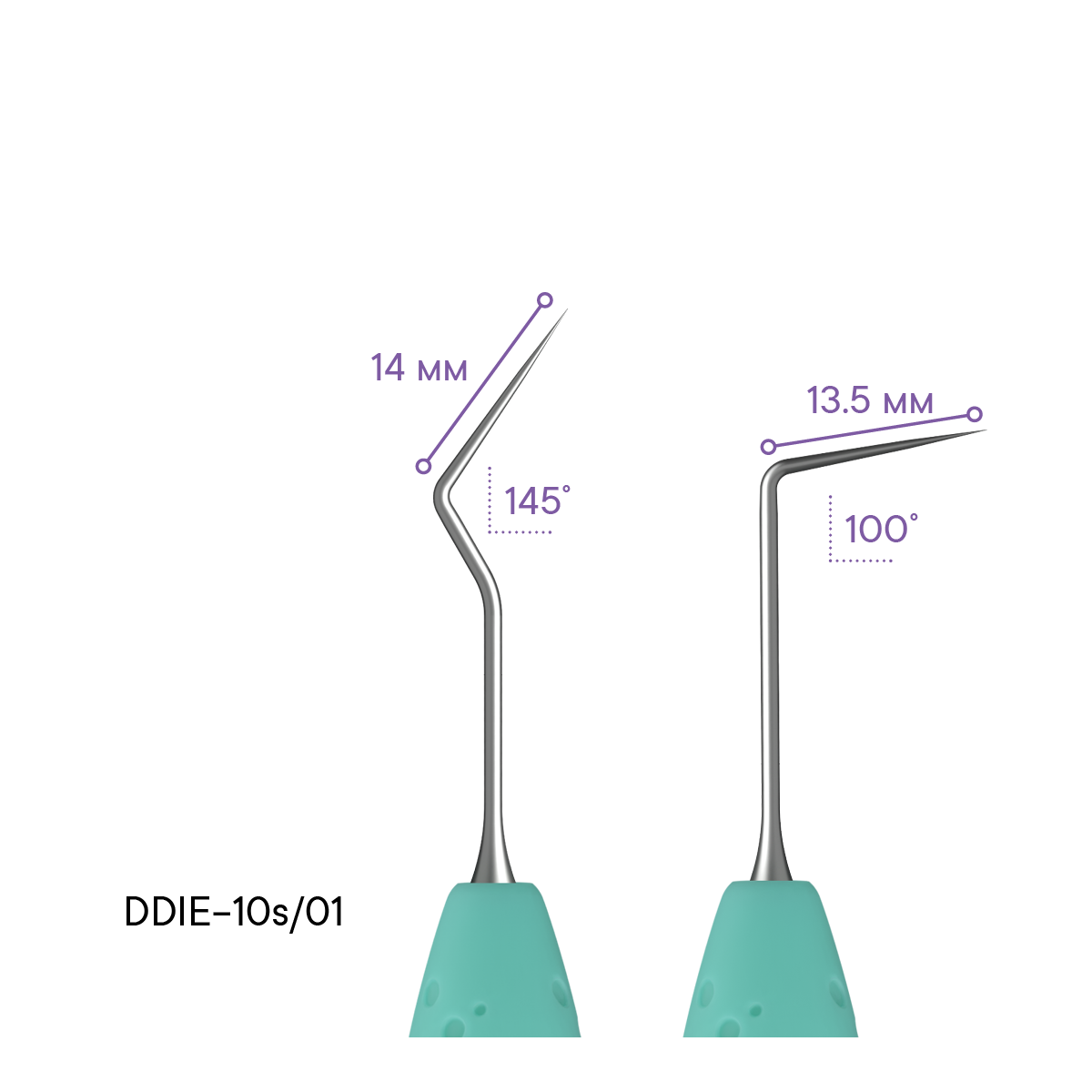 - Pracovní části sondy mají různou délku (13,5 a 14 mm) a jsou ohnuté pod různými úhly (100° a 145°), což umožňuje snadné provádění endodontických manipulací.