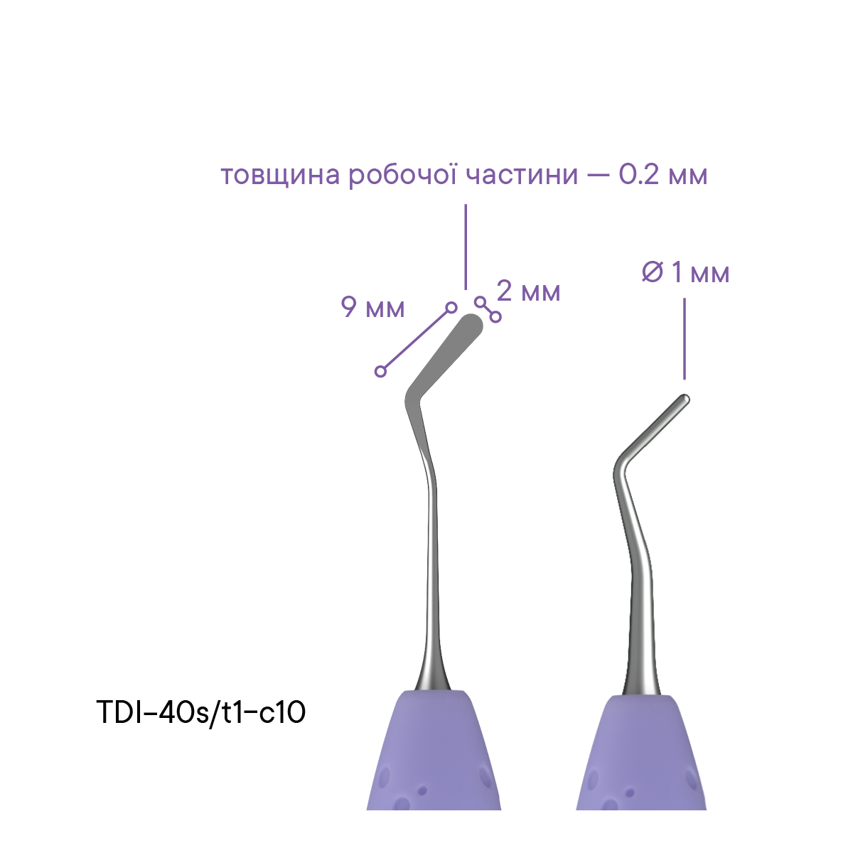 - Інструмент є комбінацією найтоншої прасування Meddins TDI 40 t1 і штопферу у формі краплі діаметром 1,0 мм.
