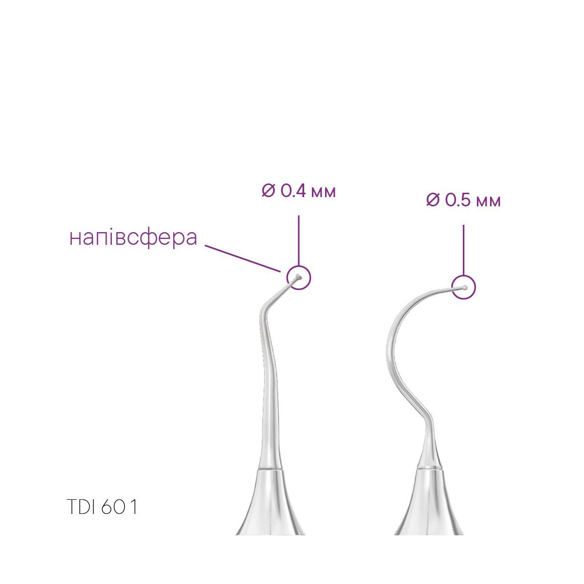 - Робочі частини: - напівсфера діаметром 0,4 мм; серп із кулястим кінчиком діаметром 0,5 мм.