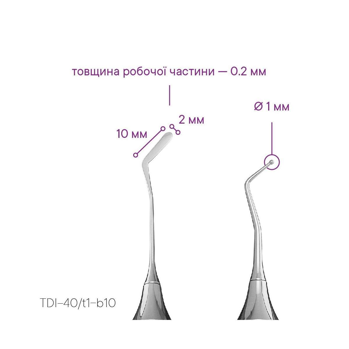 - Інструмент є комбінацією найтоншої гладилки Meddins TDI 40 t1 і штопфера у формі кулі розміром 1,0 мм.