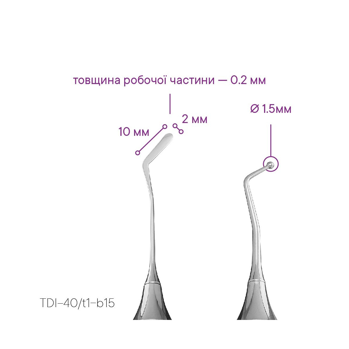 - Інструмент є комбінацією найтоншої прасування Meddins TDI 40 t1 і штопфера у формі кулі розміром 1,5 мм.